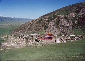 The monastery follows the Karma Kagyu tradition, but also has retreat facilities for the teachings and practices of the Shangpa Kagyu tradition. All in all there are four retreat centres situated around the monastery. They focus upon the practices of the Six Doctrines of Naropa, the The Five Golden Dharmas of the Shangpa, which includes the Six Doctrines of Niguma, the practice of Jinasagara and the practice of Sarvavid Vairocana. These are of course just the main practices followed in these four retreat centres. They are supplemented by a variety of other practices as well. In the modern picture of Benchen Monastery, taken in 2005, you see the Shangpa Kagyu retreat center in the upper right corner of the picture. It is the small white building high above the monastery.