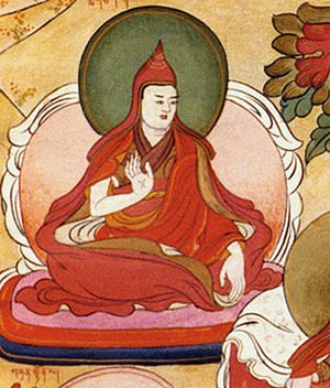 Rigongpa Chökyi Sherab (1175-1247), aka Sangye Nyentön and Nyentön Chöje, was born to a family in Yol. Much like Mokchokpa and Kyergangpa before him, he was named after the locality where he spent many years meditating and teaching, Rigong. He was naturally inclined to the dharma and sought at an early age to devote his life to benefiting others. He met his master and stayed with him in Kyergang. Lama Kyergangpa transmitted all of the secret instructions to Rigongpa, leaving nothing out. Lama Kyergangpa told Rigongpa about his past and future lives and advised Rigongpa to lead the life of a secret yogin, drinking beer, eating food offerings, wearing old rags and enjoying mixed company, which also earned him another name, that of "Bäpe Naljor" (sbas pa'i rnal 'jor) or Hidden Yogin. (However, we don't know for sure whether or not he actually followed that particular piece of advice. While it says at least in one western publication that Rigongpa was a layman, there is no clear evidence for that assumption. We rather read in his autobiography how he decided to renounce the world already at the early age of eleven, how he took novice ordination at seventeen and full ordination at age twenty. Now, that was presumably all before he met with Kyergangpa. Nevertheless, in paintings he is always depicted as wearing the monastic robes of a fully ordained monk.) Kyergangpa told Rigongpa that he would establish connections with many students and would have ten fully realized disciples who would hold his transmission and the lineage of the Shangpa lamas. Rigongpa had visions of many dakas and dakinis, especially of Sukhasiddhi, from whom he received the four complete empowerments and the main points of secret practices. Rigongpa could see many deities face-to-face, including the Six-armed Mahakala, the special protector of the Shangpa Lineage. He had a particularly close relationship with the protector and was famous for having constructed a statue of the same. Actually it was an emanation of the protector, appearing as a yogic practitioner, who constructed and consecrated the statue, by way of finally dissolving into it, with Rigongpa in close attendance. Particularly the close attendants of the protector apparently were extremely eager to please Rigongpa. So much so that he had to admonish them repeatedly in the strongest terms not to harm those whom they considered his enemies. Once, when seeing Palden Lhamo in a vision, he argued with her and insisted that she and the other attendants of the protector cease to harm human beings. It was her who then insisted that a statue of Six-armed Mahakala ought to be made. Thus the statue, and presumably a temple to house it, came to be constructed. In later centuries many great masters, including the previous Kalu Rinpoche, traveled to the Rigong area and remarked about the extraordinary blessings which both the statue and the locality still retained even then. In his later years Rigongpa traveled to various buddha realms in his dreams and was granted many empowerments and teachings. Once a dakini appeared to him, of which Rigongpa asked her name. She replied "I am Sukhasiddhi which means Bliss-Accomplishment, bliss because my mind if filled with stainless wisdom; accomplishment because one can accomplish the extraordinary siddhis within a year or month by praying to me." The dakini proceeded to grant the four complete empowerments, the main points of practice and the supreme points on realizing the non-duality of bliss and emptiness. Then Sukhasiddhi told Rigongpa, "Yogin, since your body, speech and mind are liberated, those who receive empowerments from you will never again fall into the three lower realms." Despite this prophecy, Rigongpa seems to have been somewhat disillusioned with at least some of his students. Towards the end of his life he is reported to have said, "In these degenerate times, most of those who hear the dharma do not understand it. So it is better to just be quiet." He benefited many disciples, establishing them on the path to freedom and lived more than seventy years.