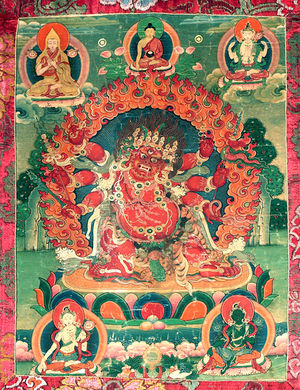 A Hayagriva practice discovered as a treasure teaching (gter ma) by Nyemo Tertön Sangye Wangchen (snye mo ba sangs rgyas dbang chen; aka rgya gong ri pa sangs rgyas dbang chen, 12th century) and Kyergangpa Chökyi Senge (1143-1216). Lama Kyergangpa was particularly devoted to the deity Hayagriva. Accordingly, in his dream practice, he visited the pure realm of Guru Padmasambhava repeatedly and received the full transmission of the "rta mgrin gsang sgrub" or "Secret Accomplishment Hayagriva." As advised by Guru Rinpoche, he also requested these transmissions from a treasure revealer in Tibet, known as Nyemo Tertön. He greatly surprised the Tertön with his requests for this practice because the Tertön had kept his discovery of these teachings a complete secret. Two times the Tertön withheld some secret oral instructions, only to be asked specifically for them later. Thus it became apparent that Kyergangpa could only have been advised to ask for them by Guru Rinpoche in person. Kyergangpa spread this teaching among his students and it eventually became popular with several lineages. Though a teaching cycle of the treasure or terma tradition, most commonly associated with the Nyingma tradition of Tibetan Buddhism, it became popular predominantly with the Sarma schools. This Hayagriva cycle of teachings continues to be practiced among Shangpa Kagyu practitioners to the present day, mainly in conjunction with the rituals of the Six-armed Mahakala, and is also very popular among various lineages of Gelugpa practitioners. The 3rd Tukwan, Lobzang Chökyi Nyima (thu'u bkwan blo bzang chos kyi nyi ma, 1737-1802), the great master of Gonlung Jampa Ling and 35th throne holder of the famous Kumbum monastery in Amdo in northeastern Tibet, wrote particularly many arrangements for this practice. [TSD]
