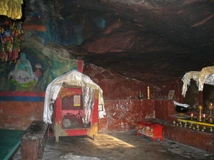Jetsun Milarepa is said to have meditated for three years in this cave. He came to Yolmo in the first place because his teacher, Marpa the translator, had indicated that his practice would be successful there. There are several references to his stay in Yolmo, in the "Hundred-thousand Songs", compiled by Tsang Nyon Heruka, as well as in several older biographies. In the immediate vicinity of the cave is a small retreat center for the nuns of Khenpo Tsultrim Gyamtso Rinpoche as well as a few individual retreat huts where the likes of this author are often to be found. Another retreat cave is situated just a 15 min. walk away. [TSD]