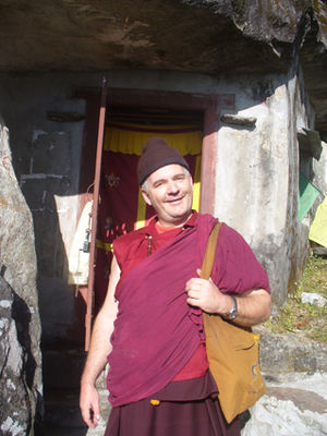 Thomas Roth, or rather (Karma) Sherab Drime as he prefers to be called again since having been re-ordained, born in 1963, is a former Radio Operator (the only "proper" profession he ever learned) and became a monk in 1981. He took refuge in 1977 from Lama Gendun Rinpoche and has been a student of Ven. Tenga Rinpoche since 1979. In 1989 he returned his ordination to Lama Gendun Rinpoche and has been a lay-person again until March 2012. He never intended to be a "translator" as such and actually only learned some Tibetan because in the late 70's and early 80's there were so few translators around, that it was at times difficult to find one when needed. Still a bit at odds with being called a translator by some, he used to interpret mainly for H.E. Drubwang Sangye Nyenpa Rinpoche and the late Kyabje Tenga Rinpoche during their annual spring courses in Kathmandu and their summer courses in Belgium. Since the passing of Kyabje Tenga Rinpoche, and H.E. Drubwang Sangye Nyenpa Rinpoche's English having improved so much that he doesn't require an interpreter any longer, he considers himself semi-retired and spends most of his time in their monastery in Kathmandu/Nepal or in retreat in [[Yolmo]] or [[Lapchi]]. His main interest, apart from anything Mahamudra, is Tibetan history, particularly the histories of the various Dagpo Kagyu lineages, the Shangpa Kagyu lineage in particular, and the Jonang school. In 2012 he took full Gelong ordination from Khenchen Thrangu Rinpoche | Thomas Roth, or rather (Karma) Sherab Drime as he prefers to be called again since having been re-ordained, born in 1963, is a former Radio Operator (the only "proper" profession he ever learned) and became a monk in 1981. He took refuge in 1977 from Lama Gendun Rinpoche and has been a student of Ven. Tenga Rinpoche since 1979. In 1989 he returned his ordination to Lama Gendun Rinpoche and has been a lay-person again until March 2012. He never intended to be a "translator" as such and actually only learned some Tibetan because in the late 70's and early 80's there were so few translators around, that it was at times difficult to find one when needed. Still a bit at odds with being called a translator by some, he used to interpret mainly for H.E. Drubwang Sangye Nyenpa Rinpoche and the late Kyabje Tenga Rinpoche during their annual spring courses in Kathmandu and their summer courses in Belgium. Since the passing of Kyabje Tenga Rinpoche, and H.E. Drubwang Sangye Nyenpa Rinpoche's English having improved so much that he doesn't require an interpreter any longer, he considers himself semi-retired and spends most of his time in their monastery in Kathmandu/Nepal or in retreat in [[Yolmo]] or [[Lapchi]]. His main interest, apart from anything Mahamudra, is Tibetan history, particularly the histories of the various Dagpo Kagyu lineages, the Shangpa Kagyu lineage in particular, and the Jonang school. In 2012 he took full Gelong ordination from [[Khenchen Thrangu Rinpoche]] and, technically, now answers to the name Karma Lodrö Samphel. | ||